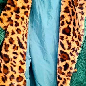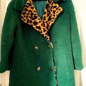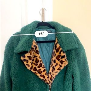 Stylish green teddy jacket. Features bold leopard print lining. Cozy and fashionable.
