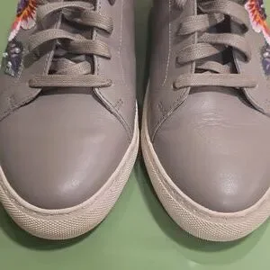 Leather upper, low-top, court-style sneakers with a flexible rubber outsole and shock-absorbing midsole. Vibrant, multi-colored floral embroidery and cushioned insoles for comfort.