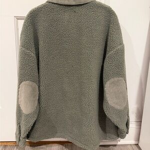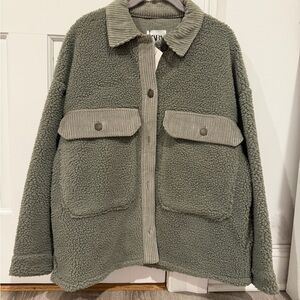 Stylish sherpa jacket with ribbed collar. Features button closure and front pockets. Green Sherpa with corduroy details. Brand new