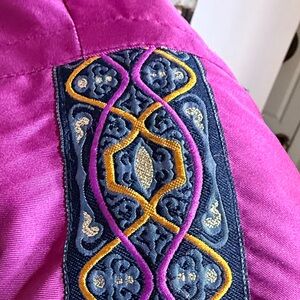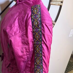 Stylish women's pink jacket featuring intricate embroidered sleeves. Perfect for adding a pop of color to your wardrobe.