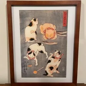 This is a high-quality inkjet reproduction of Kuniyoshi's Cats in Four Poses (1852) printed on archival matte paper and mounted in a brand new 12" x 15" (exterior measurement) brown wooden wall-hanging frame.