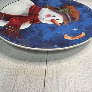 Vintage 1997 Elaine Thompson serving plate/platter. Snowman with a nighttime background. Gold trim on the edge. Plate is in excellent condition. Measures approximately 12” across as shown in picture. Please see pictures for measurements and details.