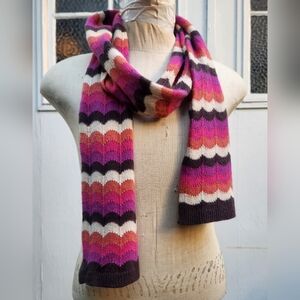 Add some fun color to your fall or winter looks with this striped lambswool knit scarf in a scalloped design of pink, orange, fuchsia, brown and cream! Excellent pre-loved condition, no pilling, holes, etc.