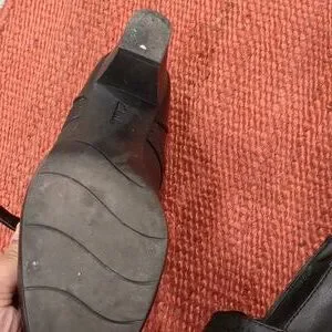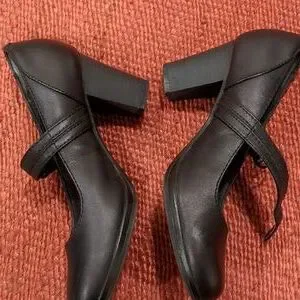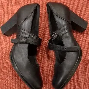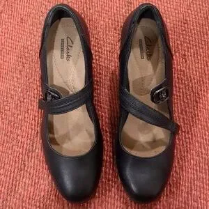 black leather Clarks Mary Jane heels, size 8 1/2. clasp closure. good condition on exterior, some marks on soles and also dust on bottoms of shoes. have a lot of life left!