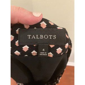 TALBOTS Geo Printed Pleated Knee Length Skirt. Black with pink and white geo printed pattern. Large pleates. Side zipper closure. Lined. Knee length. Great condition! Size 4