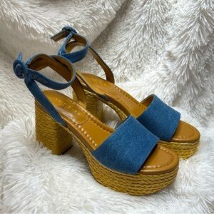 Marc Fisher LTD Palyca 2 platform sandals in denim. Stylish espadrille platform with block heel and ankle strap closure. Comfortable and versatile for spring and summer wear. Gently used, good condition.