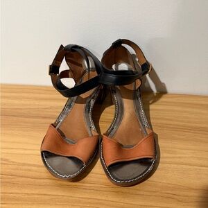 Leather Anthropologie Leifsdottir block heel sandals in women’s size 40. Mixed leather uppers in black and warm brown tones, contrast stitching, and a sturdy stacked block heel. Adjustable ankle strap with buckle closure.