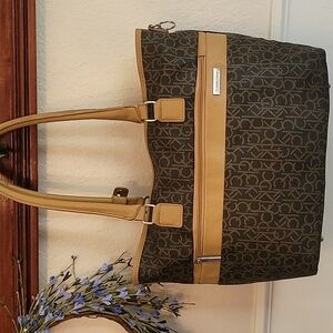 Elegant Calvin Klein carry-on with signature logo pattern. Features brown and tan color scheme. Ideal for daily use. Zip back allows to easily slip over handle of roller luggage. Minor flaw on one handle. Overall great piece.