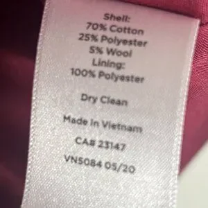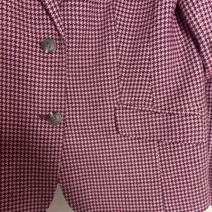 Classic Talbots single-breasted blazer jacket in a sophisticated houndstooth pattern in pink and burgundy tones, with a small amount of gray in the houndstooth pattern. The blazer has long sleeves, a button-front closure, and two front flap pockets. The interior is fully lined in a burgundy fabric. This piece is ideal for adding an academic or equestrian touch to any outfit. Online reviews suggest this style runs true to size.