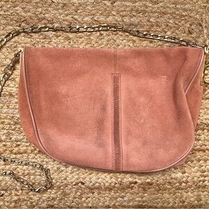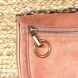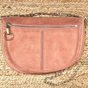 Chic crossbody bag in blush suede. Gold hardware and zip detail. Perfect for stylish outings.