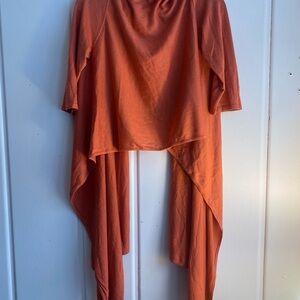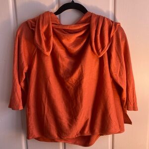 Elegant orange knit top with a draped neckline. Ideal for versatile styling.
