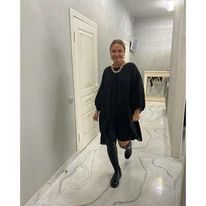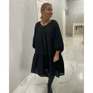 Short, A-line dress in woven fabric. Round neckline with gathers and opening at back of neck with a button. 3/4-length raglan balloon sleeves with narrow cuffs. Gathered flounce on skirt for added volume. Unlined.
