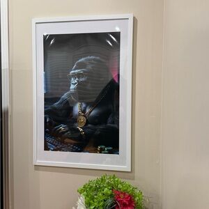 Elevate your space with this striking gorilla art print. Featuring a bold black and gold design, this piece adds a touch of sophistication to any room. The white frame complements the artwork perfectly. BRAND NEW BEST FOR THIS GIFTING SEASON