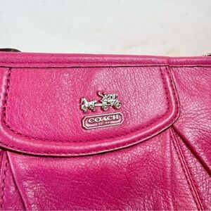 Coach pink leather mini bag with silver hardware, interior pocket, zipper closure and detachable strap. Pre-owned with some minor marks. Does not come with dustbag.