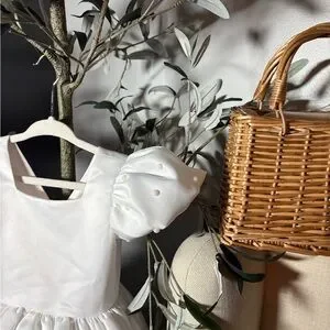 Bought on Etsy for a wedding. Toddler wore it for 2 hours only. Will include the wicker basket used for and non tradition flower girl basket arrangment.