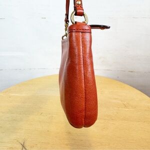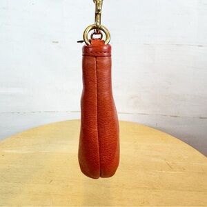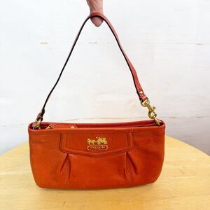 Coach orange leather mini bag with gold hardware, interior pocket, zipper closure and detachable strap. Pre-owned with some minor marks on back (pictured). Does not come with dustbag.