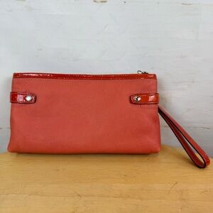 Coach orange punch-out pattern wristlet with zipper closure, detachable wristlet strap and interior pocket. Pre-owned; great condition. Does not come with dustbag.
