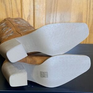 New in box ISNOM women's brown leather western cowboy boots. These knee-high boots feature intricate tonal stitching in a classic floral and scroll pattern. Designed with a square toe and a comfortable block heel, they offer a stylish silhouette. Perfect for adding a touch of Western flair to your everyday outfits or for special occasions like country concerts or weekend getaways.