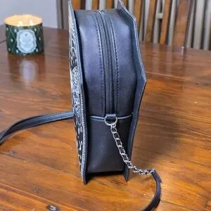 Stylish coffin-shaped crossbody bag. Features intricate white patterns. Perfect for a bold look.