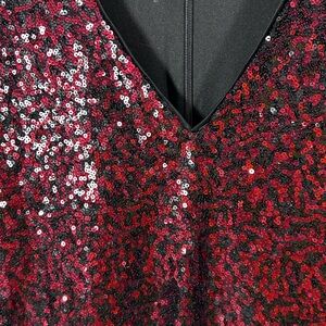 Elegant deep red and black v-neck dress with shimmering sequins. Ideal for special events.
