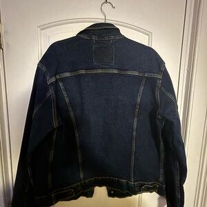 Classic Levi's denim jacket. Dark blue hue. Timeless style.