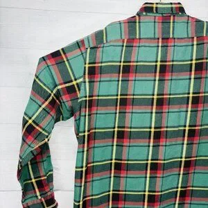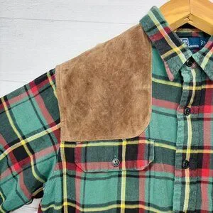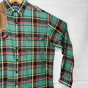 Vintage Polo Ralph Lauren Suede Shoulder Plaid Flannel Shirt Size Large Description Channel classic rugged outdoor style with this vintage Polo by Ralph Lauren tartan flannel shirt. Featuring thick 100% cotton flannel, a deep green/red/yellow plaid pattern, and a genuine suede shooting patch at the shoulder, this piece is a standout from Ralph Lauren’s earlier heritage collections.