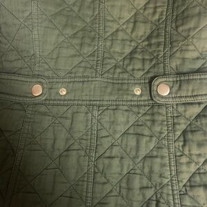 Chic olive green with quilted design. Features zip and snap front closure, pretty and soft sleeve lining, 4 front pockets with snap closure, and Gold button details with tabs in back with snaps. Versatile and stylish. Great Preowned condition