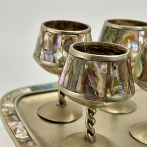 Vintage Alpaca Mexico Abalone Shell Silver Cordial Goblets Set 6 + Tray MCM