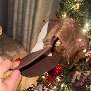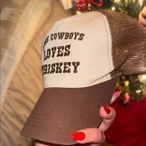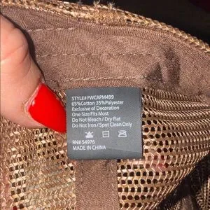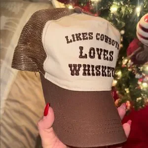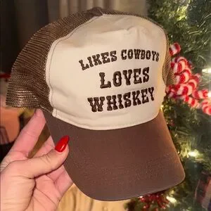 Stylish trucker hat with bold text. Features a cream front and brown mesh back. Perfect for casual wear.