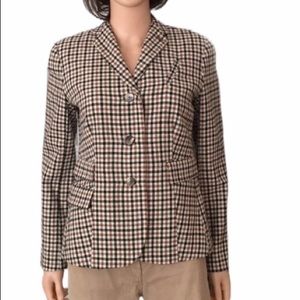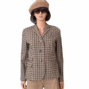 Liz Claiborne wool blended blazer, size 6, 4 front pockets unopened, above breast pocket zips, 2 inside pockets, 3 reinforced button closure, 4 buttons on each sleeve, lined, 6” vent in back excellent condition