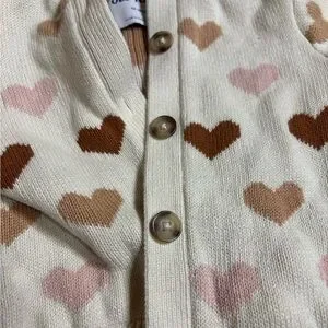 Old Navy knit cardigan hoodie with an allover heart pattern in neutral cream, blush, and brown tones. Button front with ribbed cuffs and hem. Soft and cozy layering piece.