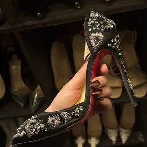 Elegant black stiletto heels adorned with intricate embellishments. Perfect for adding a touch of glamour to any outfit.