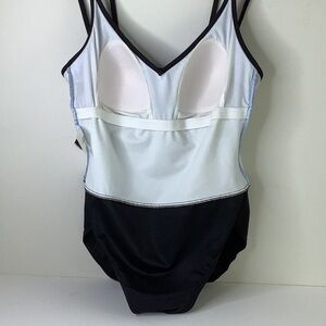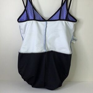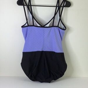 This elegant one-piece swimsuit features a striking two-tone design with a periwinkle purple black dotted top and solid black bottom. The V-neckline is accentuated with black trim, and the adjustable shoulder straps ensure a comfortable fit. A ruched detail at the waist enhances the silhouette, making it a stylish choice for swimming.