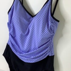 Trimshaper Purple and Black One Piece Polka Dot Swimsuit with V-Neckline