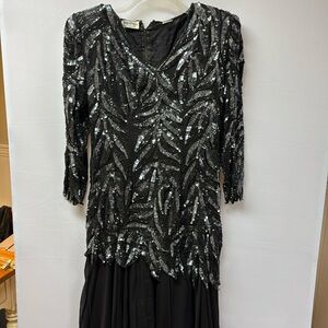 Nagpal beaded and sequin dress. Perfect mother of the bride or groom formal dress. Beautiful black beads and silver sequin dress with flowy crepe like fabric attached skirt. Asymmetrical drop waist beaded top. Three quarter scalloped sleeve. V-neckline. Shoulder pads. Hidden zipper in back. Missing eye for hook and eye closure. See last pic. Measures approximately 20” across chest and 53” length.