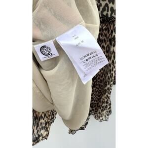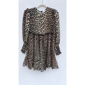 GANNI Leopard Print Babydoll Dress Size 38 Sz 6 Puff Sleeve Pleated Sheer Lined