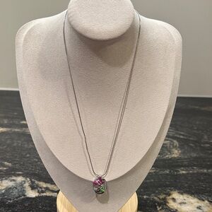 This elegant necklace features a stunning butterfly pendant with pink and green accents, perfect for adding a touch of nature-inspired beauty to any outfit.