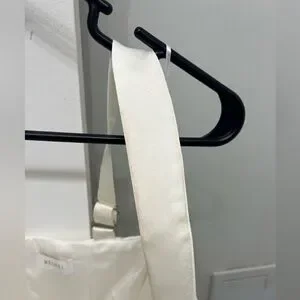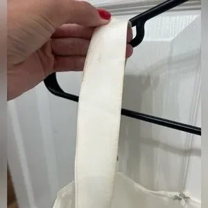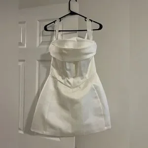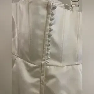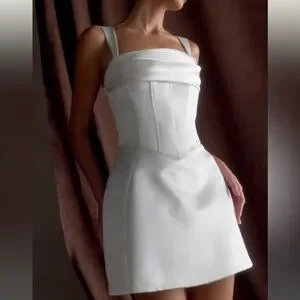 Chic white mini dress with satin finish. Features structured bodice and elegant straps. Worn once for my rehearsal dinner, some makeup stains on inside unable to see when worn. Will need to be steamed.