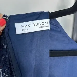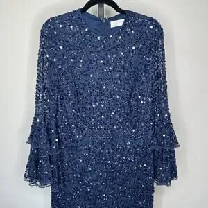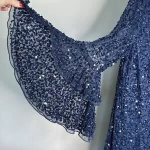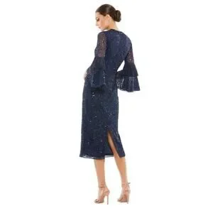 NWT MAC DUGGAL 10802 Navy Fully Sequined Ruffle Tiered 3/4 Sleeve Midi Dress