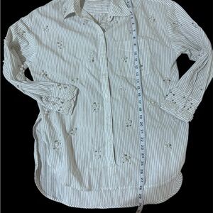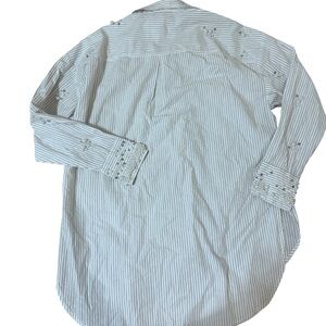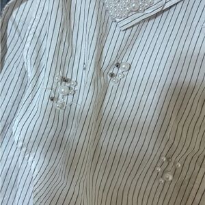 Chic button-down with delicate stripes. Features elegant pearl accents. Shirt in excellent conditions bit a few pearls have fallen. Its very oversized.