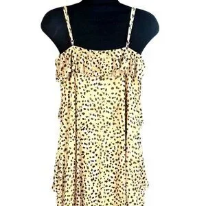 This asymmetrical leopard print dress features tiered ruffles and adjustable spaghetti straps. Crafted with a lightweight fabric blend, it offers comfort and style. New with tags.