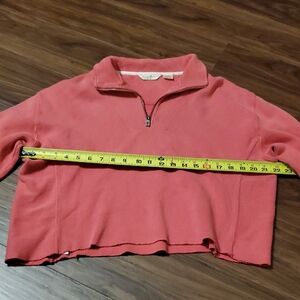 Cozy coral cropped sweatshirt with quarter-zip. Ideal for casual wear.
