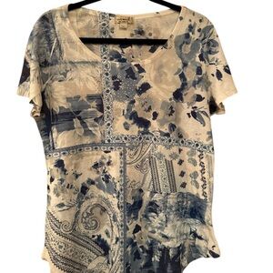 Chic shirt by ONE WORLD. Features artistic blue and white design.