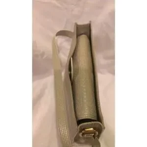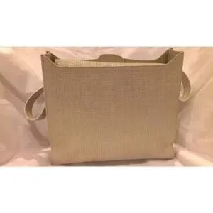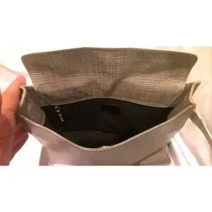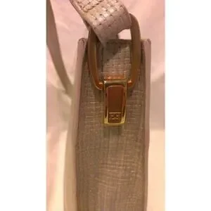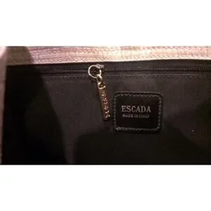 Excellent condition Escada woven leather handbag. Light olive green color & silver with mother-of-pearl look. Gold hardware. Magnetic clasp. Zipper compartment. For measurements see item specifics. Just a few of 1 cm pen marks on the interior (see last 2 photos)