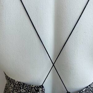 HELMUT LANG Silk Open Back Top Cross Straps Floral Print Twill Black White