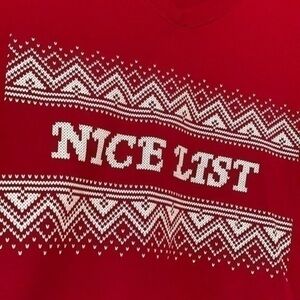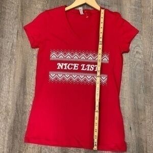 Nice List holiday T-shirt. V-neck. Red with white graphic print. Cotton. Size medium