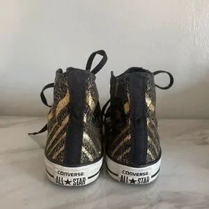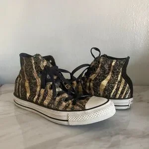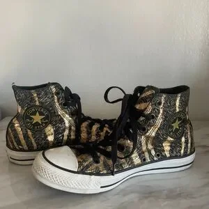 Stylish high-top sneakers. Black and gold tiger stripe design. Iconic Converse logo on the side.