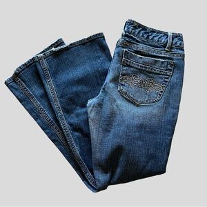 Super cute, curvy, low rise, great fitting jeans. Pre-Owned. Good condition.