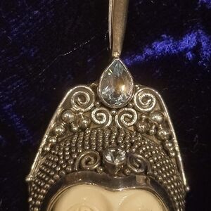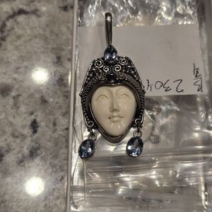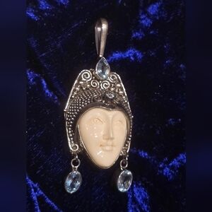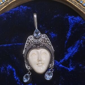 Accentuate your inner goddess with this unique pendant. The carved face is complimented by aquamarine stones that dangle and sparkle โจ๏ธ