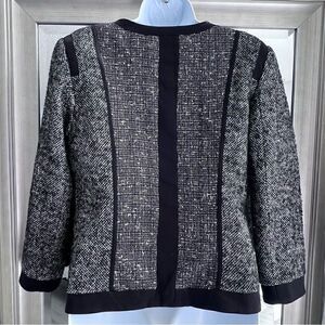 Timeless bolero jacket style on light tweed in grey and black. Great designer details.